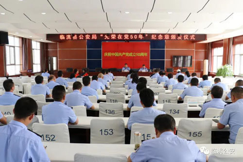 为热烈庆祝中国共产党成立100周年,6月25日下午,甘肃省临洮县公安局举行“光荣在党50年”纪念章颁发仪式,向全局党龄50年以上的离退休党员干部颁发纪念章。局党委副书记、政委兰建伟参加颁发仪式,仪式由局党委委员、纪委书记田晓强主持。