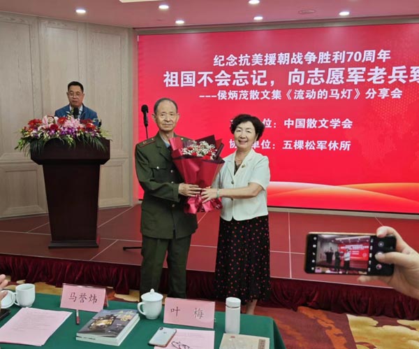 中国散文学会会长叶梅首先向志愿军老战士、散文集《流动的马灯》作者侯炳茂献花并致辞,她指出:“即将到来的7月27日是朝鲜战争停战70周年的重大纪念日。1950年10月19日,中国人民志愿军在彭德怀司令员兼政治委员率领下肩负着保卫祖国、维护和平的伟大使命,毅然出征,以正义之师行正义之举,投身于那场艰苦卓绝的战争。中华儿女舍生忘死,英勇作战,取得了抗美援朝战争的伟大胜利。今天我们各位作家相聚在一起,并举行曾经参加抗美援朝的老战士候炳茂同志的散文集《流动的马灯》作品分享会,正是为了向老一辈革命家,向那些在抗美援朝战争中气壮山河、出生入死的英雄们致以最崇高的敬意!并向志愿军烈属、军属致以崇高的敬意!”