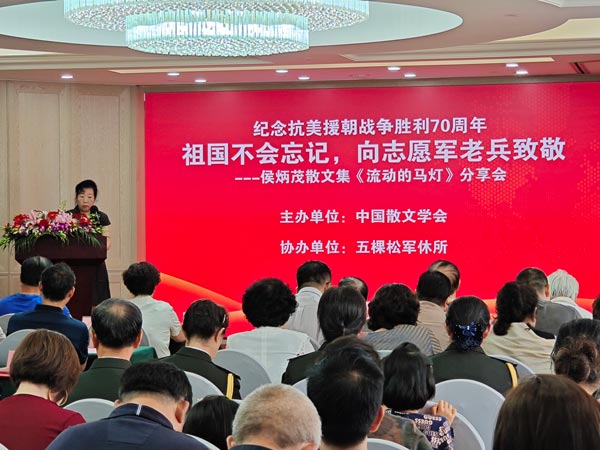 7月23日,由中国散文学会主办,北京五棵松军休所协办的纪念中国人民志愿军抗美援朝胜利70周年、祖国不会忘记、向英雄老兵致敬——侯炳茂抗美援朝题材散文集《流动的马灯》分享会在北京举行。中国散文学会会长叶梅,中国作协社联部二级巡视员丰玉波,名誉会长周明、石英、吴泰昌、王宗仁,彭德怀、宋时轮同志的家属代表张峰、宋佰一以及军旅军史散文作家柳建伟、马誉炜、周振华、乔秀清、王贤根、田霞、沈晓泓、聂虹影、王小班、庄志霞、张莉娟、赵晏彪、朱金平、李金明、肖跃华、兰宁远、王洁、董山峰、张社卿、刘存根、塘萍、胡伟、王然、王立军、赵胜利、凌翔、商泽军、胡松夏、笑石、肖江、曾祥书、王晓君、黑建军、刘书良、桑农、戴荣里、郭薇、林梓豪暨会员代表,作者单位代表和有关媒体100多人参加活动。分享会由中国散文学会常务副会长红孩主持。