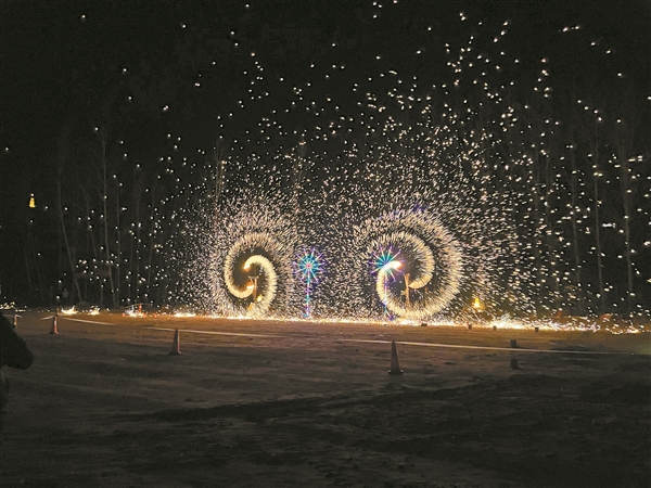 农历二月二,夜幕降临,非遗技艺“打铁花”在寿阳县景尚乡张韩河村第三届民间艺术节精彩上演。六位打铁花手艺人分为两组,每组三人配合,两处开花,两人用长长的钳子夹着坩土勺轮流舀取铁水向外抛出,另一人手持浸湿的木板击打铁水,在木板的重重撞击下,铁水迸发开来,冲天而起、光彩夺目,火树银花的盛景照亮张韩河村的夜空。