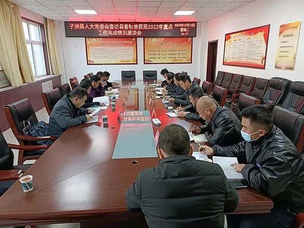 12月13日下午,子洲县人大常委会党组成员张峰带领县人大常委会委员吴瑞、刘永东、张世金、曹惟钧等一行五人查访了县畜牧兽医局2022年重点工作任务完成情况。座谈会由县人大常委会委员、机关二级主任科员吴瑞主持,局机关全体人员、局属各单位主要负责同志参加。