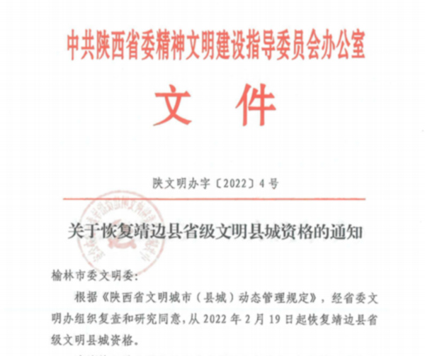 文件通知,根据《陕西省文明城市(县城)动态管理规定》,经省委文明办组织复查和研究同意,从2022年2月19日起,恢复靖边县省级文明县城资格。(王笑天)