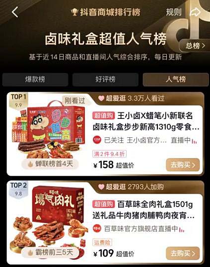 凤爪零食领导品牌王小卤借助年节热点与国民IP势能,洞悉年轻人求财、求好运心理,推出“王小卤抓财手礼盒”与蜡笔小新联名款“步步新高”“新想事成”等多款卤味年货礼盒,凭借其精准的消费趋势洞察和出彩的创意设计,在百花齐放的年货市场异军突起,上市仅半月就热销近20万份,相比去年同期增长超300%,成为年轻人年货采购的新潮流。据抖音榜单显示,王小卤抓财手礼盒、蜡笔小新联名礼盒均在抖音“品牌卤味礼盒爆款榜”与“品牌卤味礼盒好评榜”位列前4,并登卤味礼盒超值人气榜TOP1和TOP3。