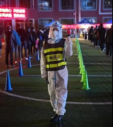 十月的兰州,秋叶飘落,寒风萧瑟,穿上密封的防护服,志愿者们默默坚持坚守在核酸检测现场,一站就是一天。帮助维护核酸检测队伍秩序,帮助老年人和行动不便的人员,检查提醒人员及时打开健康码,按照健康码进行人员分流。一天下来,志愿者们防护服里的衣服湿透了,声音嘶哑了,站在寒风中瑟瑟发抖,却没有一个人抱怨,也没有一个人退出,次日,依旧按照最高标准、最硬作风,很早就出现在任务集结点,照常开展工作。相关任务完成后,队伍立即根据警备区相关工作安排,赶赴团结新村封控小区支援二分队,一起开展封控小区相关工作。