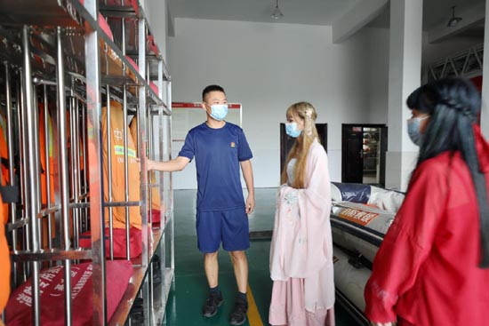 8月26日,湖北省咸宁市咸安区消防救援大队桂乡大道消防站上演了一段暖心故事。16时58分,在桂乡大道消防站的岗亭值班室门口两名汉服小姐姐匆匆赶来,送上西瓜、苹果、荔枝等水果和养乐多饮料,正当她们准备转身离开时,被消防员挽留了下来,带她们参观了消防站。她们表示,“消防员的工作很辛苦、很伟大、也很危险,我们一直都很热爱消防,在我们心里,你们就是英雄!”